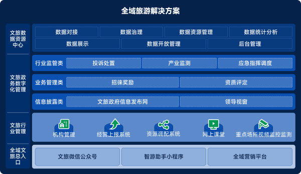 涵蓋旅游信息感知和采集,網絡傳輸、共享服務的智慧基礎建設,實現全要素、全服務、全周期的自主驅動、多方協同、自主創新,融合旅游公共服務、行業監管、營銷宣傳等為一體的全場景智慧旅游應用體系。